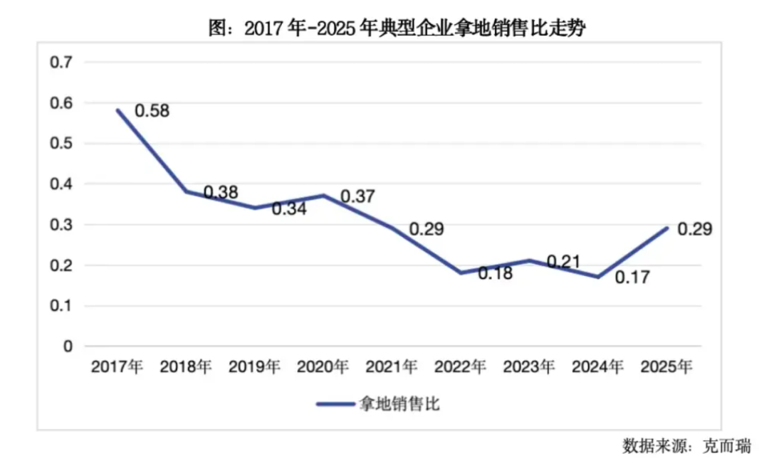 拿地销售比企稳回升。2025年销售全口径前100企业拿地销售比平均为0.29,较2024年上升0.12,回归到2021年投资力度水平,主要是规模房企积极投资所带动。同时,值得注意的是,百强中仍有近五成企业2025年未有土地入账。