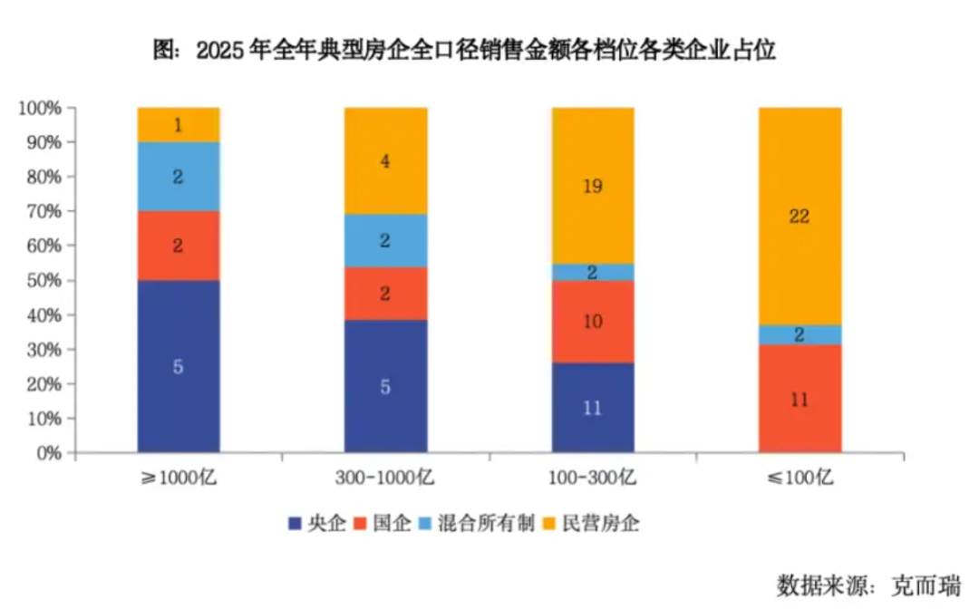 从各档位典型房企性质分类来看,全年销售规模超过1000亿元的房企中仅有1家民营房企,且越靠后档位民营房企占比越高。
