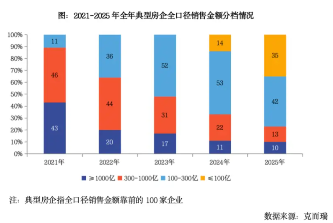从典型房企全口径销售情况来看,2025年销售规模超过1000亿元企业共有10家,300-1000亿元企业有13家,100-300亿元企业有42家,100亿元以下企业有35家。