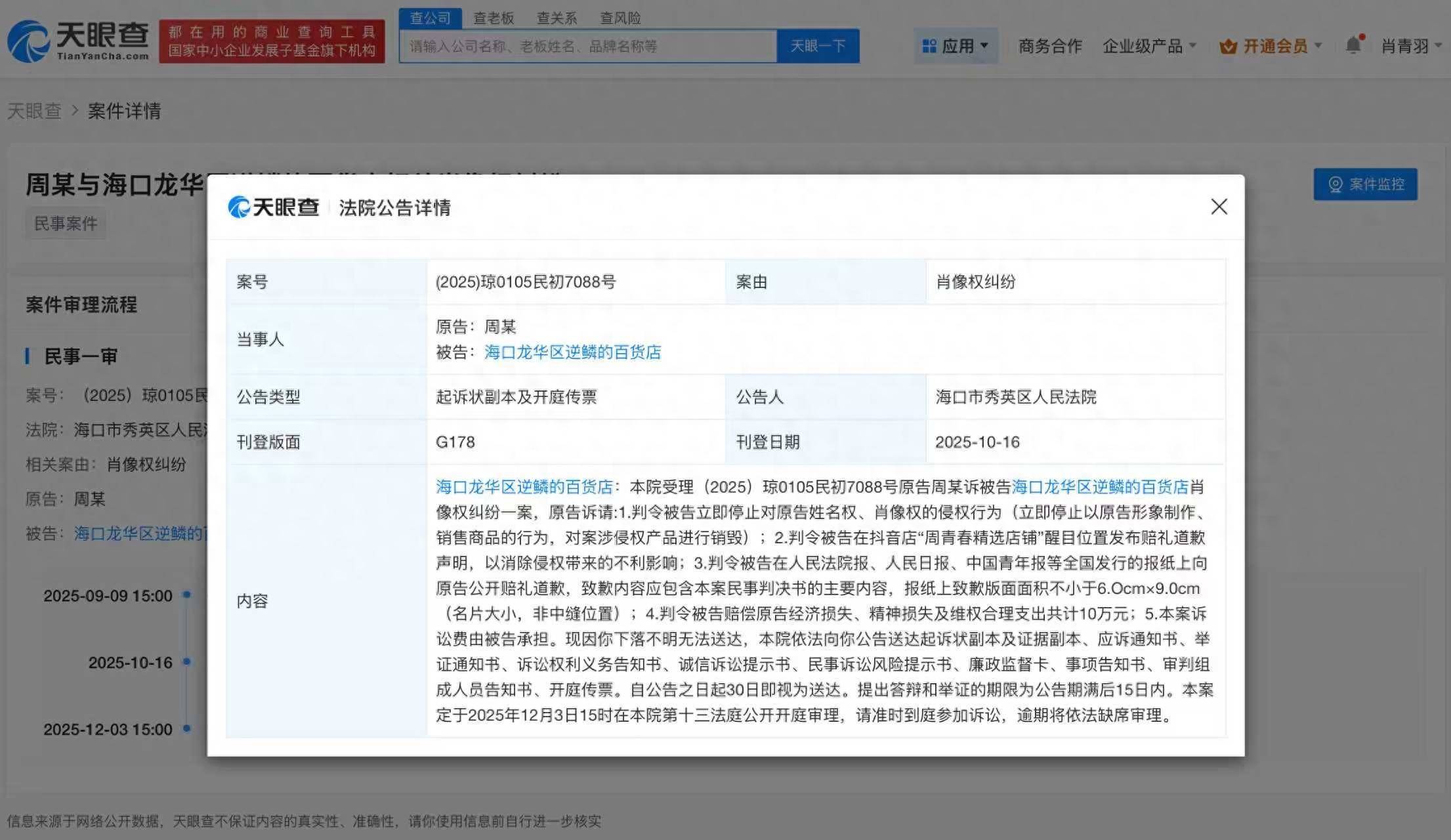 天眼查App显示,近日,海口市秀英区人民法院向海口龙华区逆鳞的百货店公告送达起诉状副本及证据副本、开庭传票等,涉及与周杰伦相关肖像权纠纷。公告显示爱一配,周杰伦请求判令被告立即停止对其姓名权、肖像权的侵权行为,在网店发布赔礼道歉声明,并在全国发行的报纸上公开赔礼道歉。同时,判令被告赔偿其经济损失、精神损失及维权合理支出共计10万元。自公告之日起30日即视为送达,并定于2025年12月3日开庭审理。