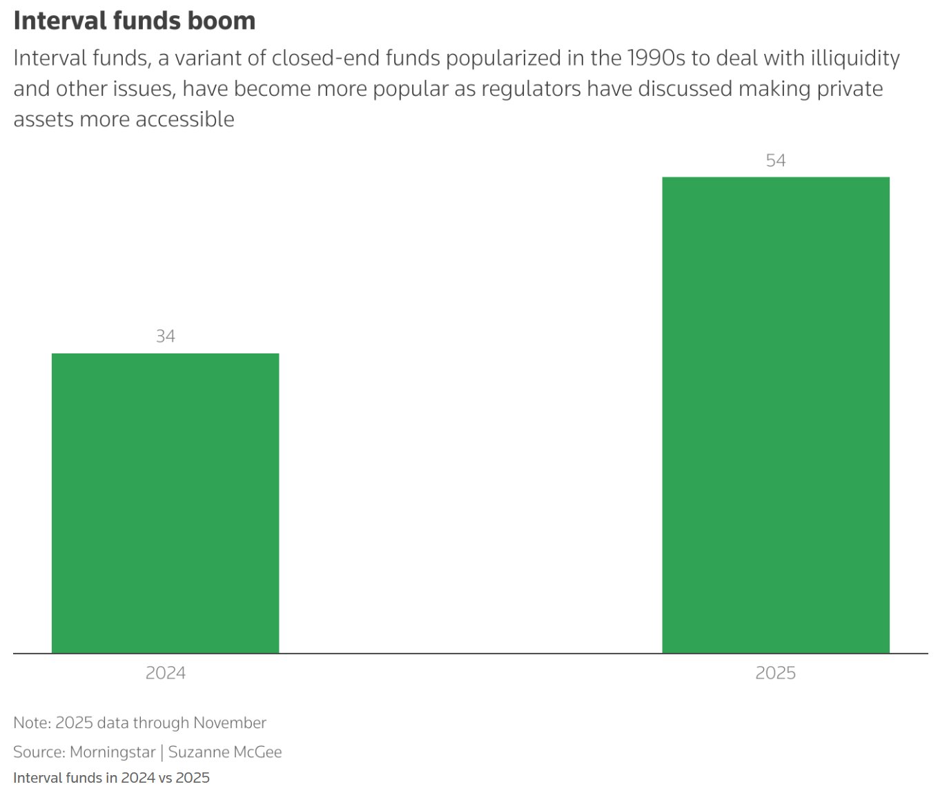 晨星公司的数据显示,自 9 月引入通用上市标准以来,新的加密货币 ETF 数量有所增加。Bitwise 资产管理公司近期预测,2026 年可能还会有 100 只相关产品面世。此外,间隔基金(Interval funds,一种投资于私人资产的封闭式基金)也有所增加,因为它们被视为能从退休计划的开放中获益。